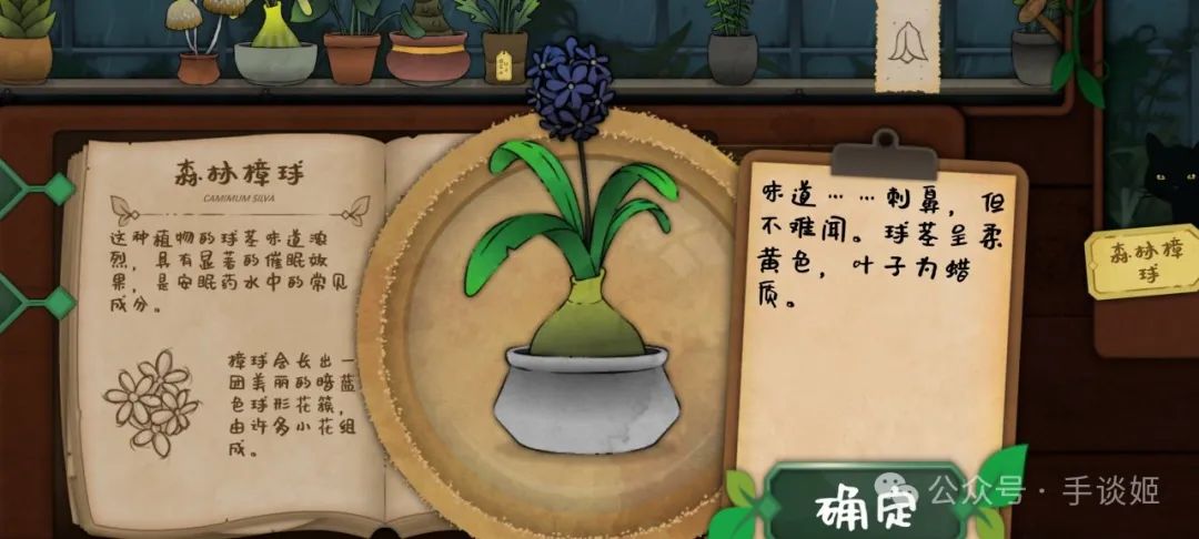 比如一位客人说她失眠了,于是我们翻箱倒柜,看到了一种叫“森林樟球”的植物。手册上说樟脑丸会长出深蓝色的球形花簇。从图案可以看出,花朵是六片花瓣,植物散发出浓郁的味道。从一堆植物中取出看起来像森林樟脑丸的物体,仔细检查,获得与笔记完全一致的味道的更详细描述,然后将其交给客人。完成后还要做一个标签(如果太麻烦,游戏有自动标签功能)。