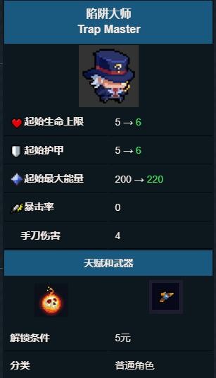 陷阱大师面板属性均衡,无明显弱点;被动死亡爆炸为其提供了强大的清理小怪能力;其在第一武中的精准钩枪伤害高,控制效果强,可以将敌人拉到前方发射手刀,对部分敌人有奇效,还可以通过第二形态快速行进;但这种武器的子弹飞行速度较慢,攻击远距离目标时效果不佳。况且把敌人拉到面前,有时会在脚下扔块石头,对拉不动的敌人伤害也很低,利弊相当明显。